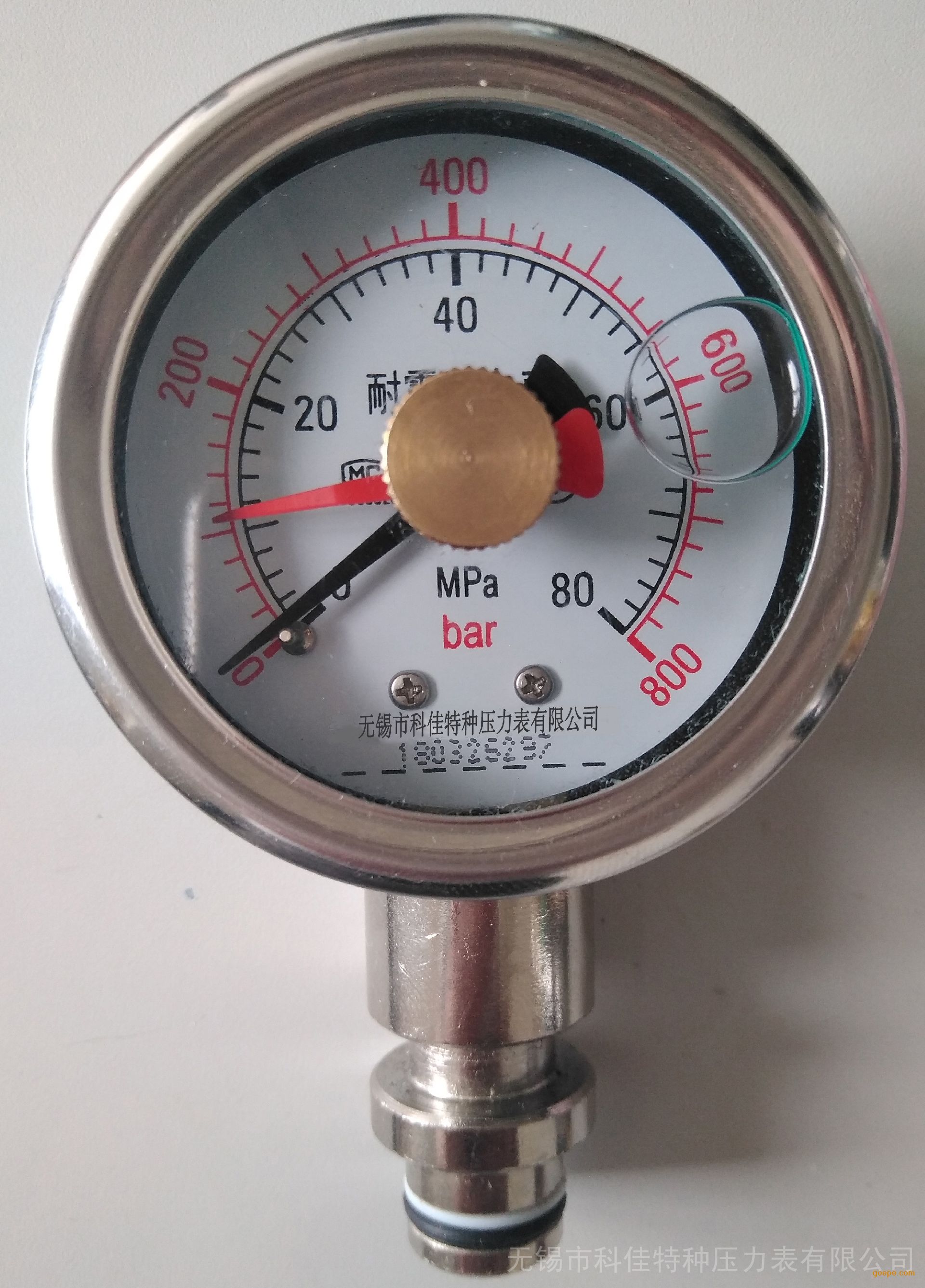 1、在使用前,先用手将付针(红针)回零,然后再进行压力测试,其中主针(黑针)显示当前压力,付针显示测试过程中*大压力。